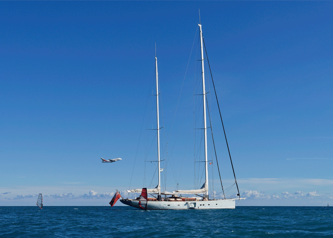 Tu as eu la chance de pouvoir capturer ce magnifique voilier avec en plus la présence de cette planche à voile qui nous donne une idée de la taille du bateau, à cela s'ajoute un avion qui vient de quitter la piste sans qu'aucun élément ne vienne se superposer, bravo, c'est un tiercé gagnant.