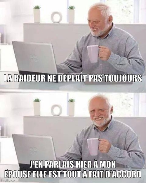 Citation de: egtegt² le Aujourd'hui à 12:02:35La raideur ne déplait pas toujours, j'en parlais hier à mon épouse elle est tout à fait d'accord :)