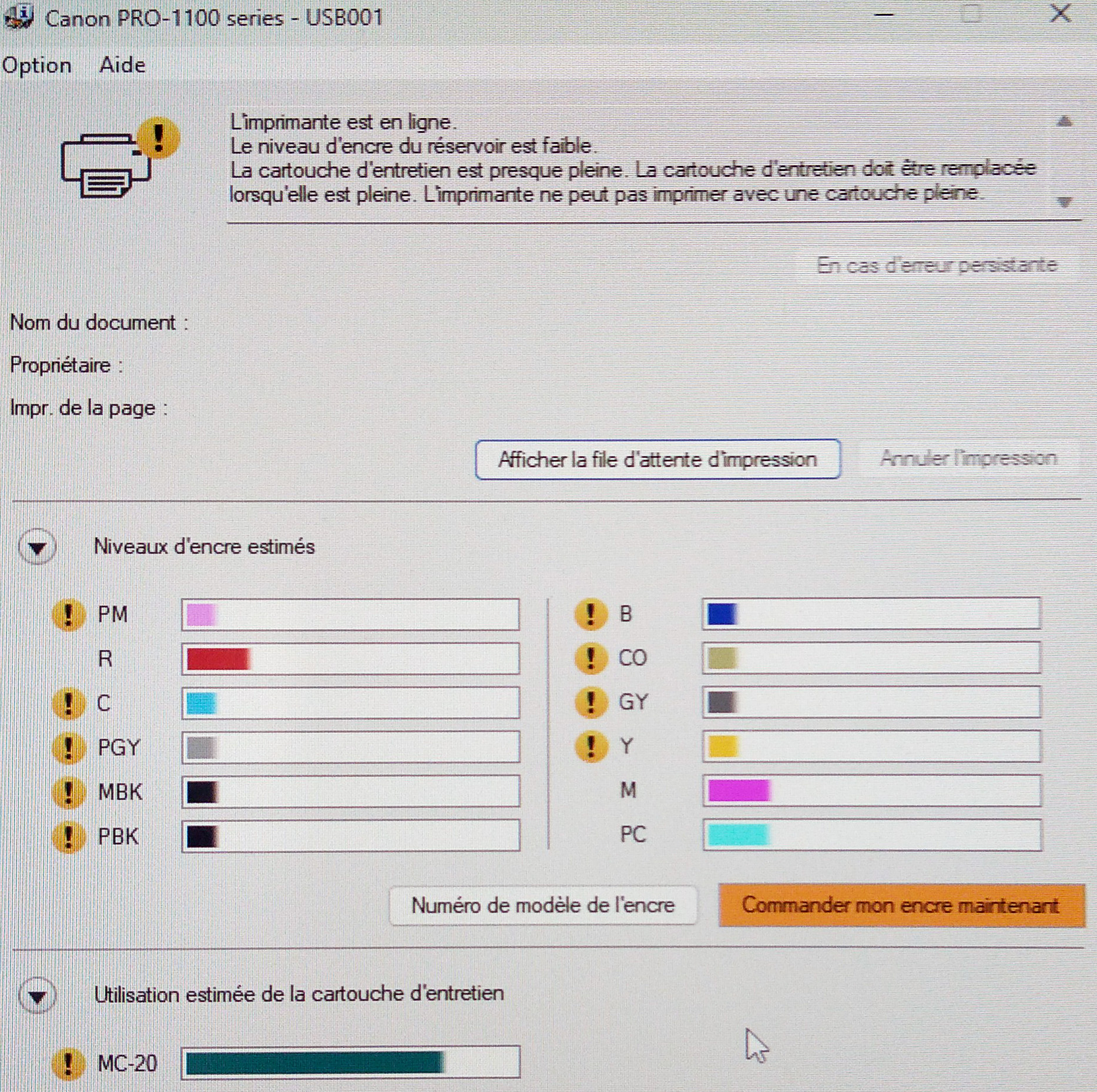 Avec ma Canon la barre verte grandie après le remplissage de maintenance.