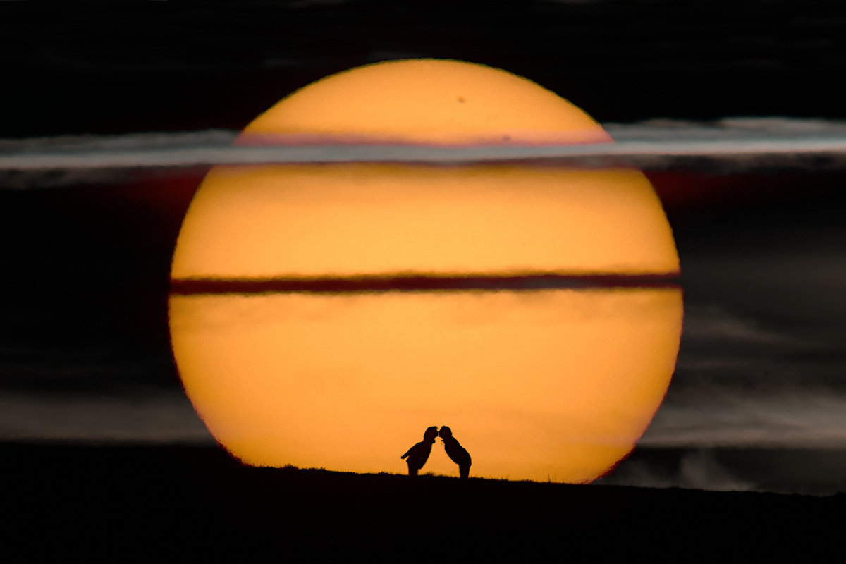 Couple dans le coucher de soleil, à 1.2 km de distance. J'ai déjà eu des ambiances nuageuses, mais un tel rendu dans le ciel, c'est bien la première fois.