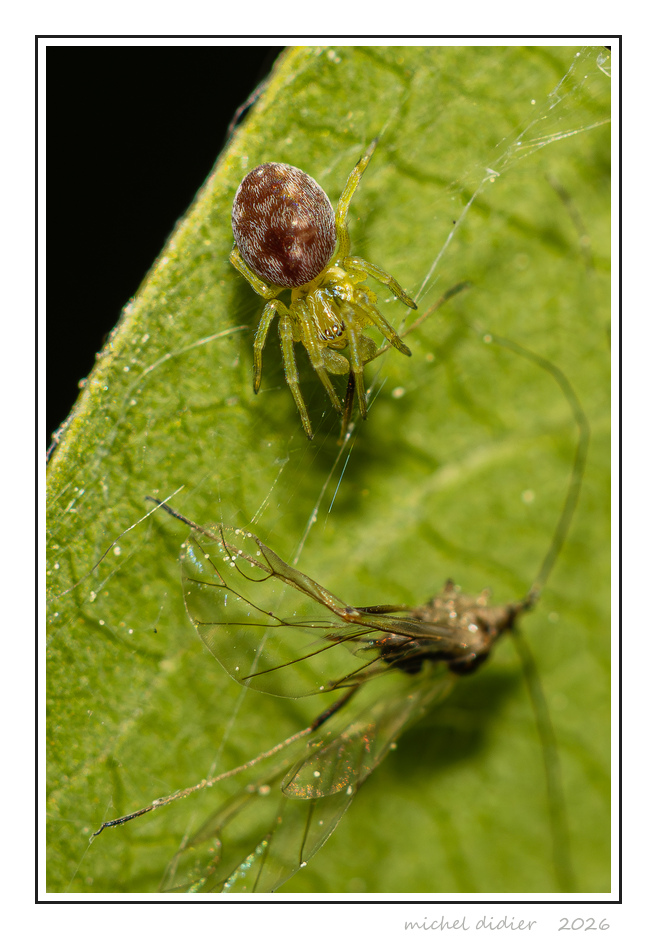 Une araignée (de plus) que je ne connais pas. Obsidentify me dit Nigma flavescens. J'ai un très gros doute en raison des couleurs de la bestiole, > 2 mm, allier 240 m.