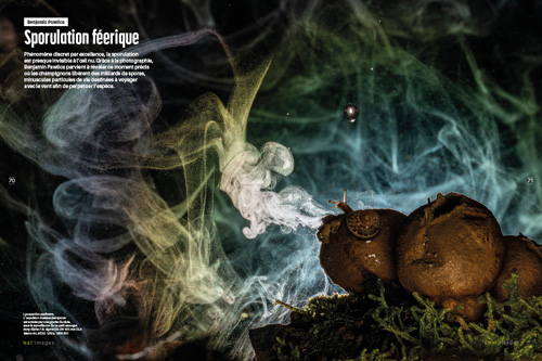 Grâce à une technique photo éprouvée, Benjamin Pawlica parvient à révéler ce moment précis où les champignons libèrent des milliards de spores, comme autant d’étoiles dansant dans la nuit.